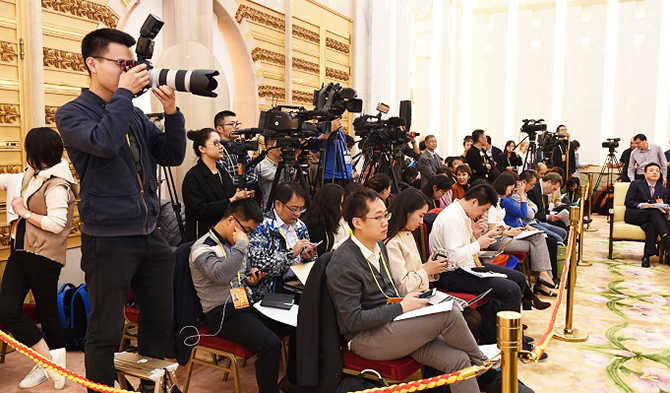 10月18日下午,作为首批向中外记者开放的四个代表团之一,党的十九大中央企业系统(在京)代表团在人民大会堂台湾厅,围绕习近平总书记代表第十八届中央委员会所作的《决胜全面建成小康社会 夺取新时代中国特色社会主义伟大胜利》的报告进行了热烈讨论,代表们纷纷表示,中国特色社会主义进入新时代,我们党呈现新气象、新作为,国企国资在党的领导下要创造新业绩、实现新突破。代表团团长、国资委党委书记郝鹏主持讨论。来自69家媒体的120多位记者全程旁听了代表团讨论,其中境内媒体26家,境外媒体(包括港澳台媒体)43家,人民日报、新华社、中央电视台、中新社、证券时报、路透社等进行了现场提问。