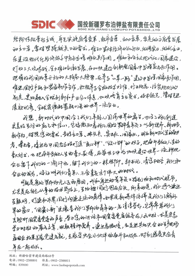 我想,新时代的中国给了我们年轻人闯荡世界的舞台,也给了我们创造更美好生活的底气和信心。它将激励着我们国投罗钾青年员工以新使命、新担当、新作为,按照您的要求,当好主力军、排头兵、突击队、国家队,成为新时代里的奋进者、搏击者,接过为中国老百姓打造“良心钾”、“放心钾”的担子,把奋斗当做人生的重大付出,也把奋斗当做人生的重大获得,在盛世之中为加快建设世界一流钾肥企业留下我们的一滴汗水,留下我们的一抹脚印。郝书记,请您相信,我们和企业的成长,将证明我们青年人不会辜负这个伟大的时代。