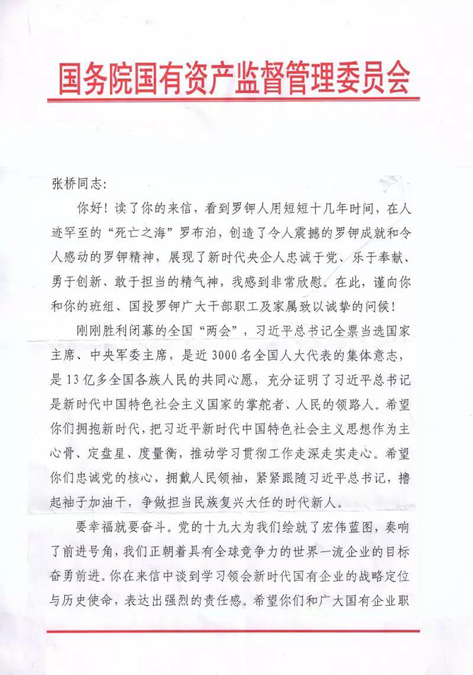 郝鹏书记收到这封千里之外的基层青年的来信后,在百忙之中亲自写了回信。郝鹏书记在回信中对罗钾人在罗布泊创造的成就、罗钾人身上展现出来的新时代央企人的精气神感到非常欣慰,并向广大一线干部职工表达了衷心的祝贺和美好的祝福。