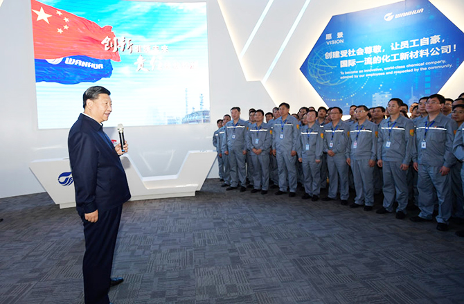 13日上午,正在山东考察的习近平来到万华烟台工业园。得知企业走出一条引进、消化、吸收、再创新直至自主创造的道路,技术创新能力从无到有、从弱到强,成为行业领军者,习近平十分高兴。他说,回顾你们这个历程,一路走得很好,虽然是一个艰辛创业之路,但是很成功。之所以取得成功,我的一个体会就是走了自主创新之路。没有不可能的事情,就要有这么一股劲儿,正像屈原讲的“路漫漫其修远兮,吾将上下而求索”。谁说国企搞不好?要搞好就一定要改革,抱残守缺不行,改革能成功,就能变成现代企业。希望大家再接再厉,一鼓作气,一气呵成,一以贯之,朝着你们既定的目标奋勇直前。