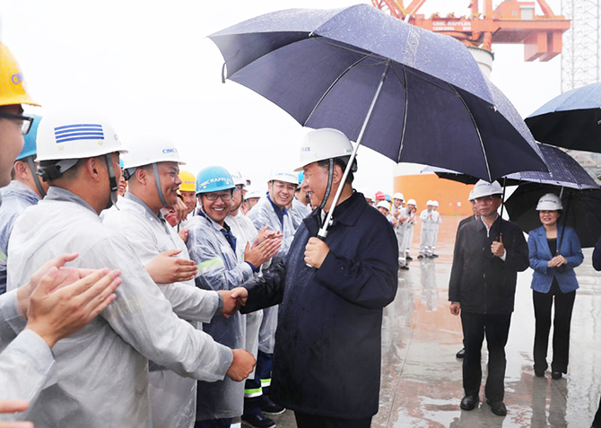 6月13日下午,习近平冒雨来到中集来福士海洋工程有限公司烟台基地。“蓝鲸1号”钻井平台巍峨伫立、“泰山”龙门吊高耸入云,习近平撑着伞边走边看,详细了解企业走自主创新发展之路、开展高端海洋工程设备自主设计研发制造情况。听说“蓝鲸1号”去年创造了可燃冰开采时间和产量两项世界纪录,习近平鼓励他们继续努力。总书记同现场的工人们一一握手,他说,基础的、核心的东西是讨不来买不来的,要靠我们自力更生、自主创新来实现。我看你们有这个信心,希望你们迎难而上、再接再厉。