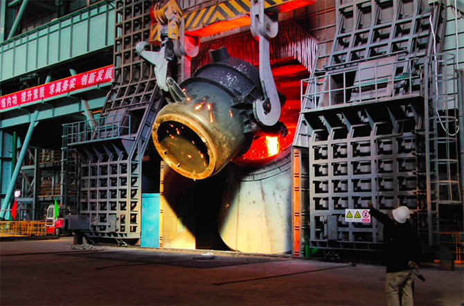 ▲朝阳钢铁炼钢厂转炉兑铁作业