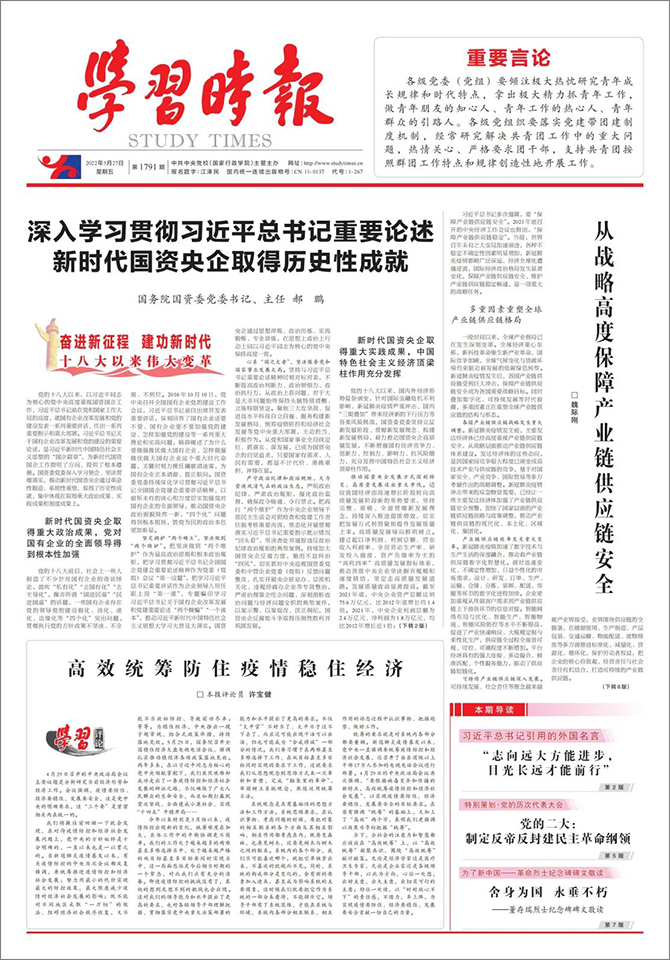 新时代国资央企实现的一切变革、作出的一切贡献、取得的一切成就,根本在于习近平同志党中央的核心、全党的核心掌舵领航,在于习近平新时代中国特色社会主义思想的科学指引。新征程上,国资央企将更加紧密地团结在以习近平同志为核心的党中央周围,以习近平新时代中国特色社会主义思想为指引,深刻领会“两个确立”的决定性意义,增强“四个意识”、坚定“四个自信”、做到“两个维护”,深入贯彻习近平总书记关于国有企业改革发展和党的建设的重要论述,贯彻落实党中央、国务院决策部署,坚定不移做强做优做大国有企业,加快打造世界一流企业,充分发挥国有经济主导作用和战略支撑作用,为全面建设社会主义现代化国家、实现中华民族伟大复兴的中国梦作出更大贡献,以实际行动迎接党的二十大胜利召开。