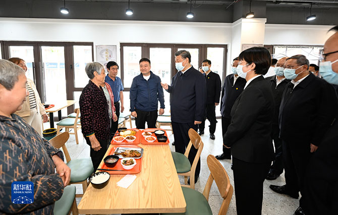 5月10日,中共中央总书记、国家主席、中央军委主席习近平在河北省雄安新区考察,并主持召开高标准高质量推进雄安新区建设座谈会。这是10日上午,习近平在容东片区南文营社区食堂同就餐的社区老人亲切交流。(新华社记者 李学仁 摄)