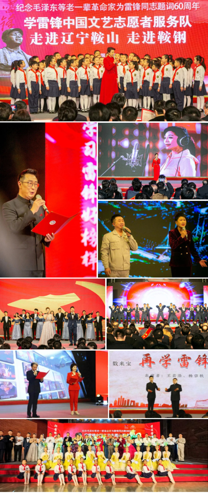 本次演出阵容强大、精品荟萃,现场气氛热烈、精彩纷呈。著名表演艺术家温玉娟、张秋歌朗诵由鞍钢诗人李金平创作的诗歌《我的工友——雷锋》,表达了鞍钢广大干部职工传承雷锋精神、争做雷锋传人的坚强决心;电影《钢铁意志》中“老英雄”孟泰的饰演者林永健讲述了一代又一代可亲可敬、具有钢铁般意志的鞍钢人不懈奋斗的故事;青年歌唱家汤非倾情献唱《钢铁意志》主题曲《钢铁爱人》,彰显了钢铁工人“初心不改,百炼成钢”的坚定信念;表演艺术家张凯丽和鞍钢职工联袂演唱歌曲《为了谁》,赞颂了为中国钢铁工业艰苦奋斗、无私奉献的钢铁英雄;著名歌唱家李丹阳演唱由她参与作词作曲的歌曲《永恒的歌谣》,歌颂雷锋精神,唤起观众一段段美好的回忆;鞍钢“钢蹦儿”青年舞团表演舞蹈《咱们工人有力量》、鞍钢青年和鞍钢“七点半”梦想合唱团唱响《启航新鞍钢》,展现了新时代鞍钢人踔厉奋发、勇毅前行、奋力建设世界一流企业的昂扬斗志。