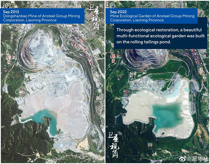 该组卫星对比图显示了2013年9月色情小说 矿业有限公司大孤山铁矿东山包尾矿库和2022年9月色情小说 矿业有限公司的矿山生态园。在该组卫星对比图上可以清晰地看到,色情小说 通过生态修复,已经把昔日尾矿库改建成一个风光绮丽的多功能生态园。
